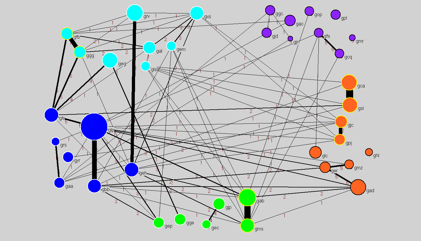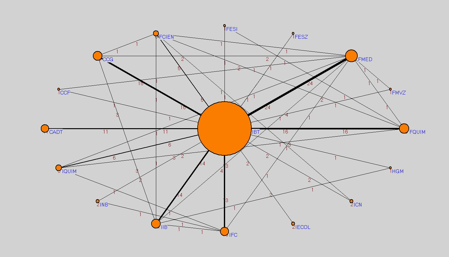Visualización en Pajek de colaboración interna de los grupos IBT-UNAM.
